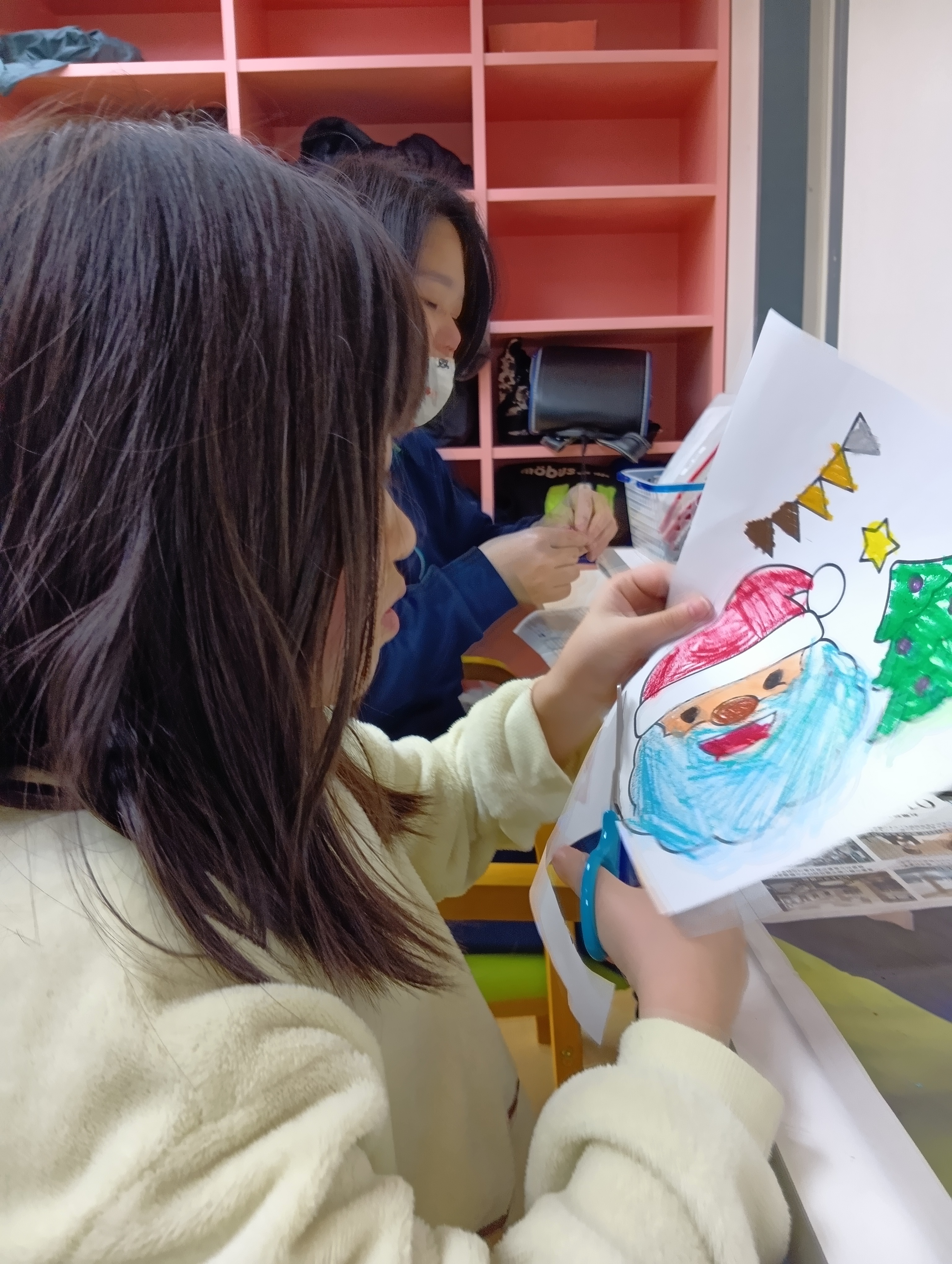 子どもたちはサンタの塗り絵をし、色を塗った後ははさみを使って丁寧に周りを切り取っていきます。