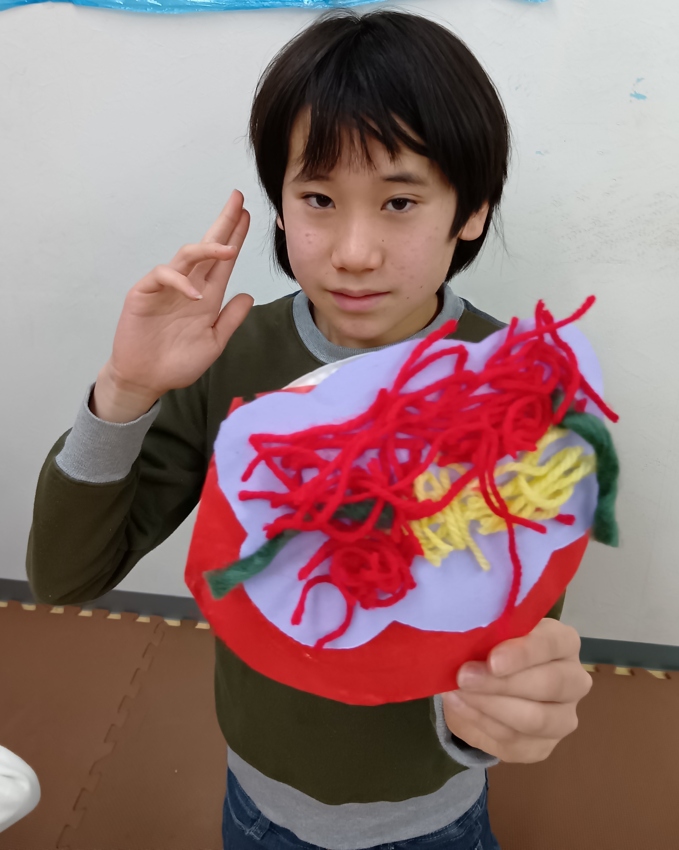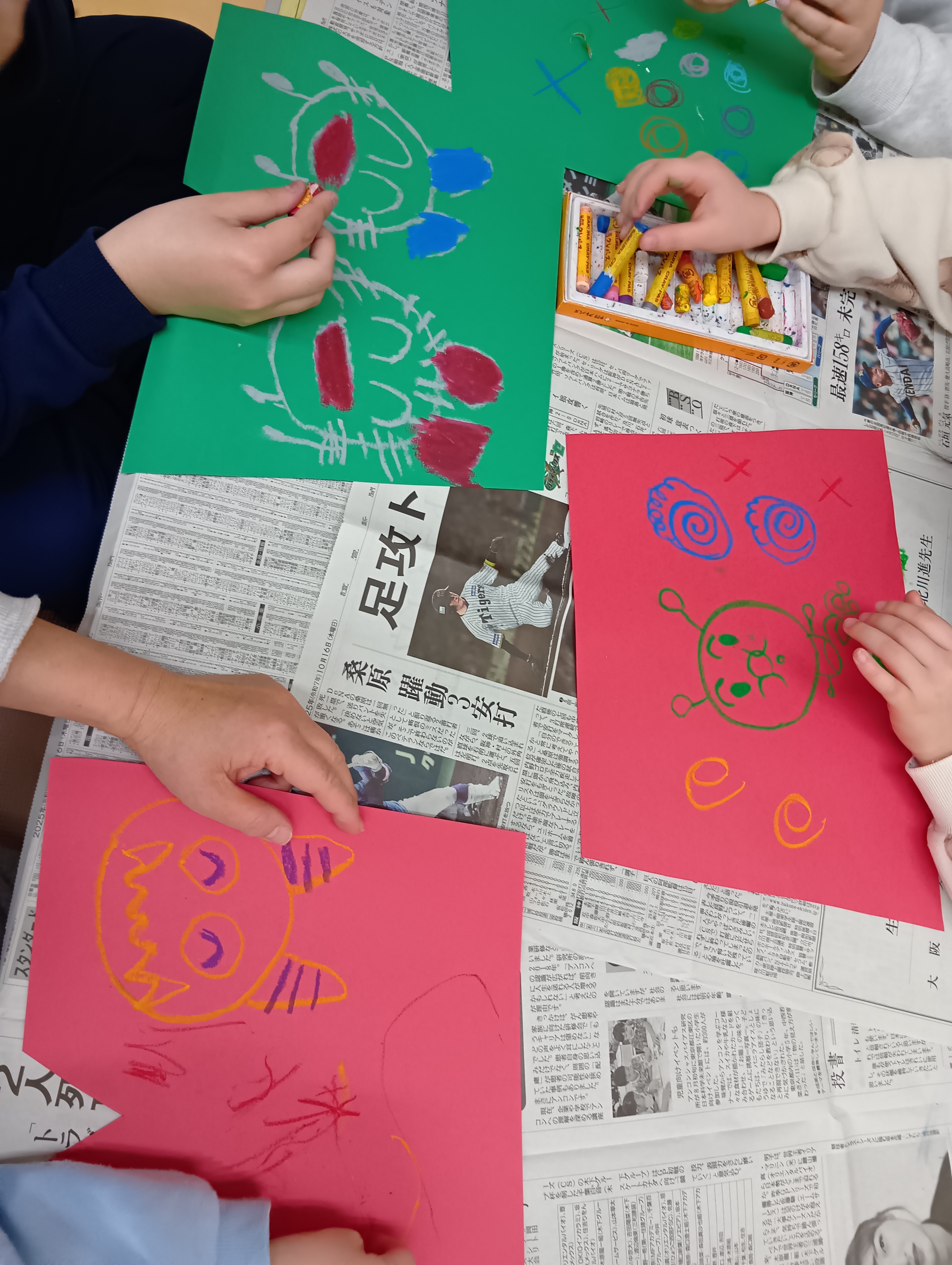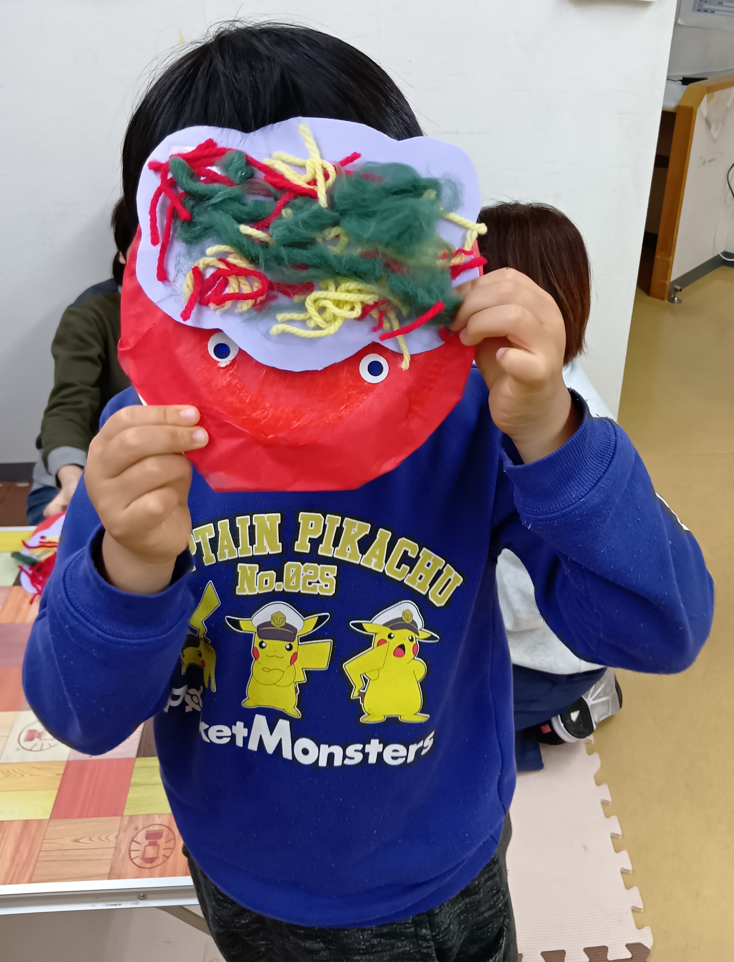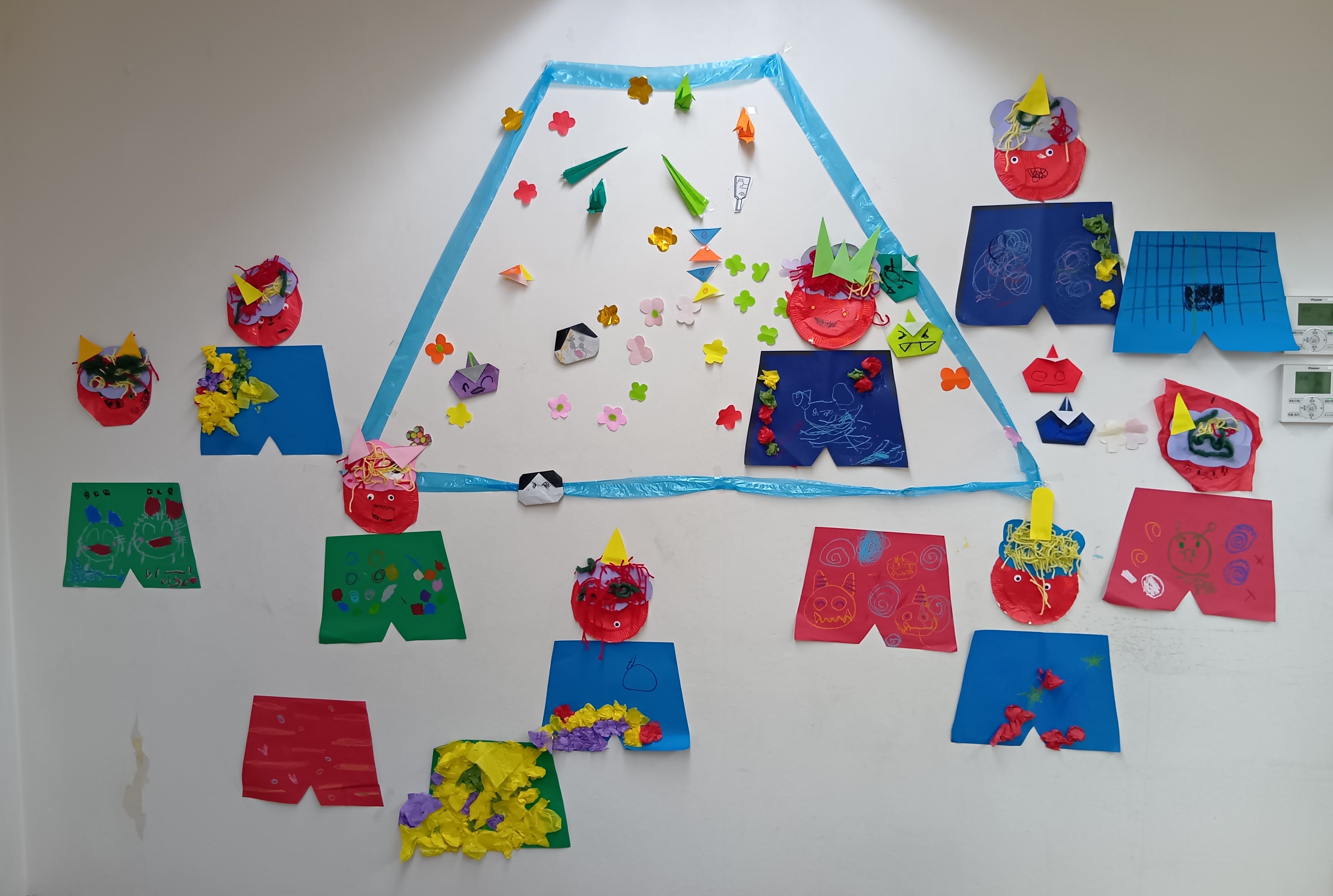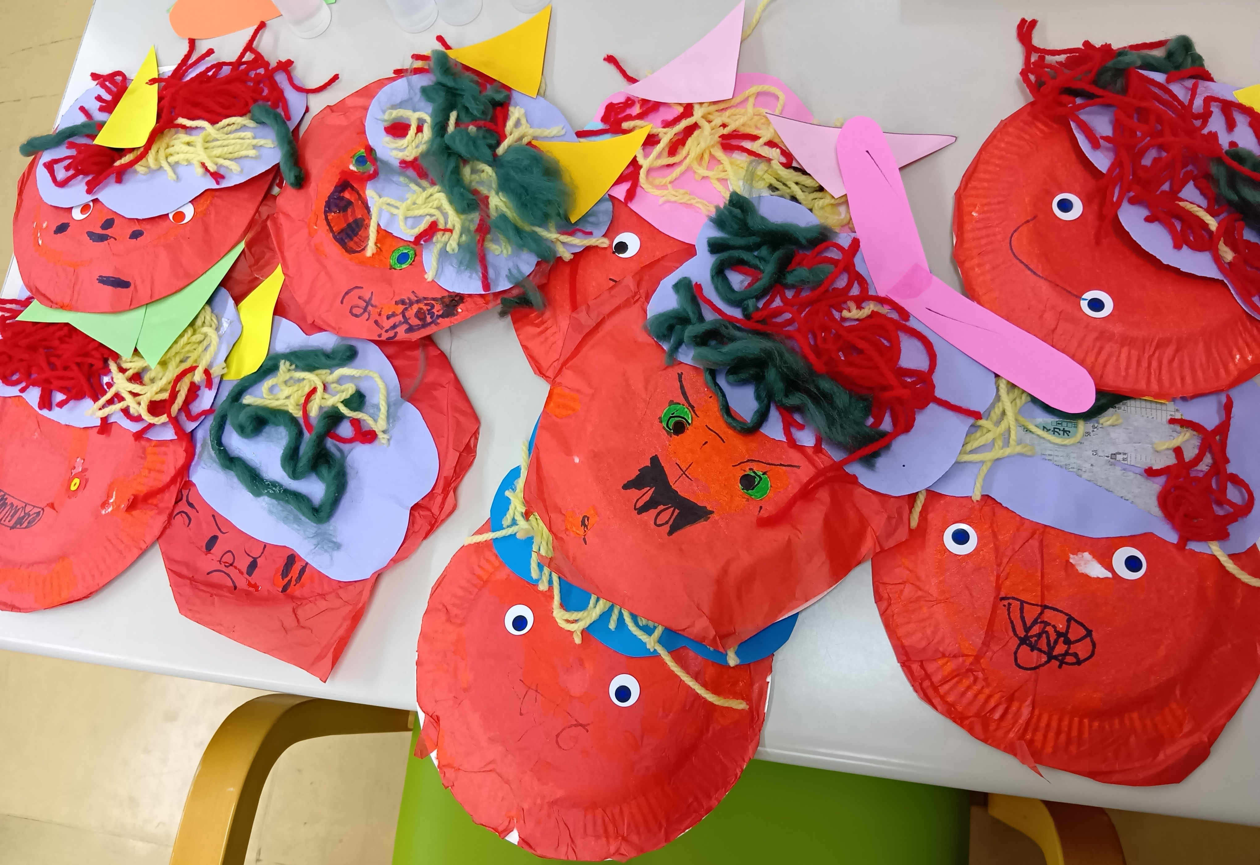 みんなで鬼のパンツとお面を作り、壁に飾り付けました。 個性豊かな表情の鬼たちが並びました。