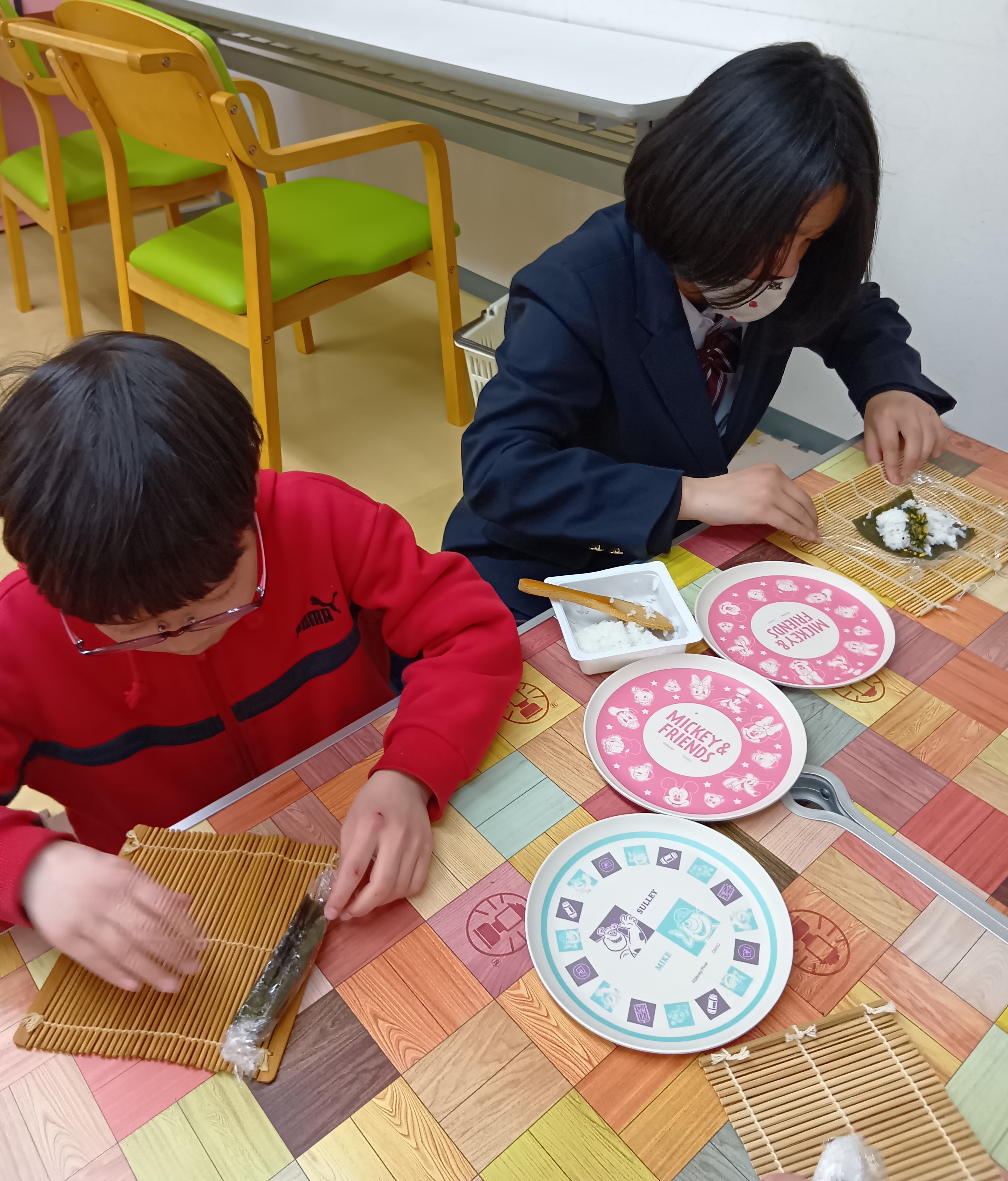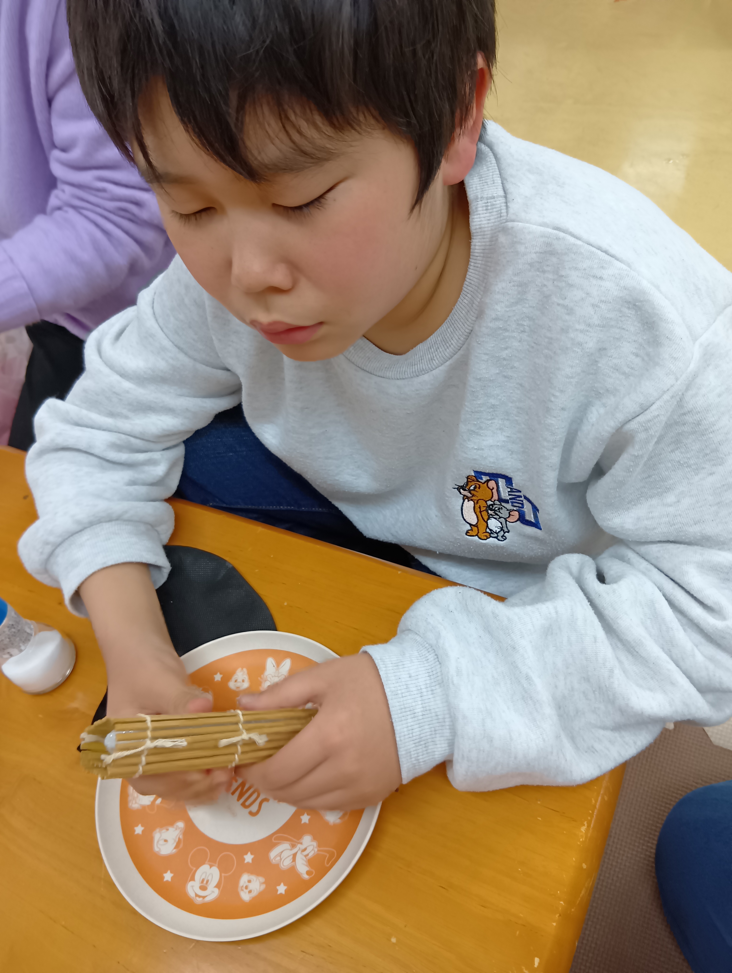 恵方巻づくりも挑戦。 巻きすを使う本格的な工程に、みんな真剣な表情。